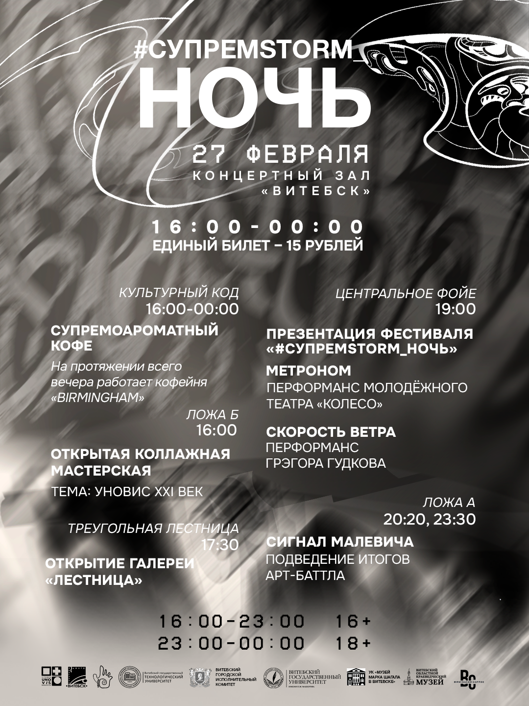 27 февраля Витебск встречает долгожданную #СУПРЕМSTORM_НОЧЬ – интерактивный мультижанровый фестиваль, посвящённый Казимиру МАЛЕВИЧУ и творческому объединению УНОВИС. Это переход от чёрно-белой зимы в красочную весну!